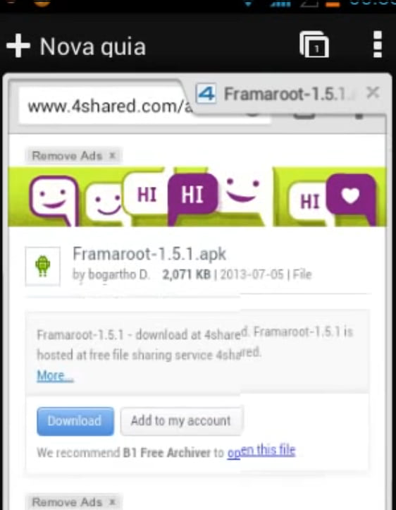 Com seu aparelho Android totalmente carregado e em mãos, você precisará do aplicativo chamado Framaroot. Abra o navegador do dispositivo que deseja rootear e baixe aqui o arquivo necessário para o procedimento.